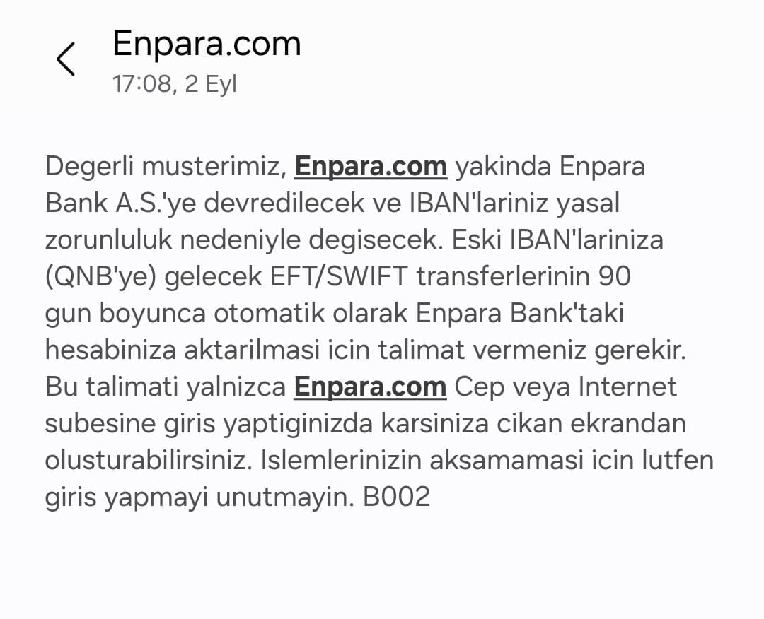 Mesajda, IBAN değişikliğinin yasal zorunluluk olduğu belirtilirken, eski IBAN’lara gelecek EFT ve SWIFT transferlerinin 90 gün boyunca otomatik olarak yeni hesaplara aktarılacağı bildirildi.